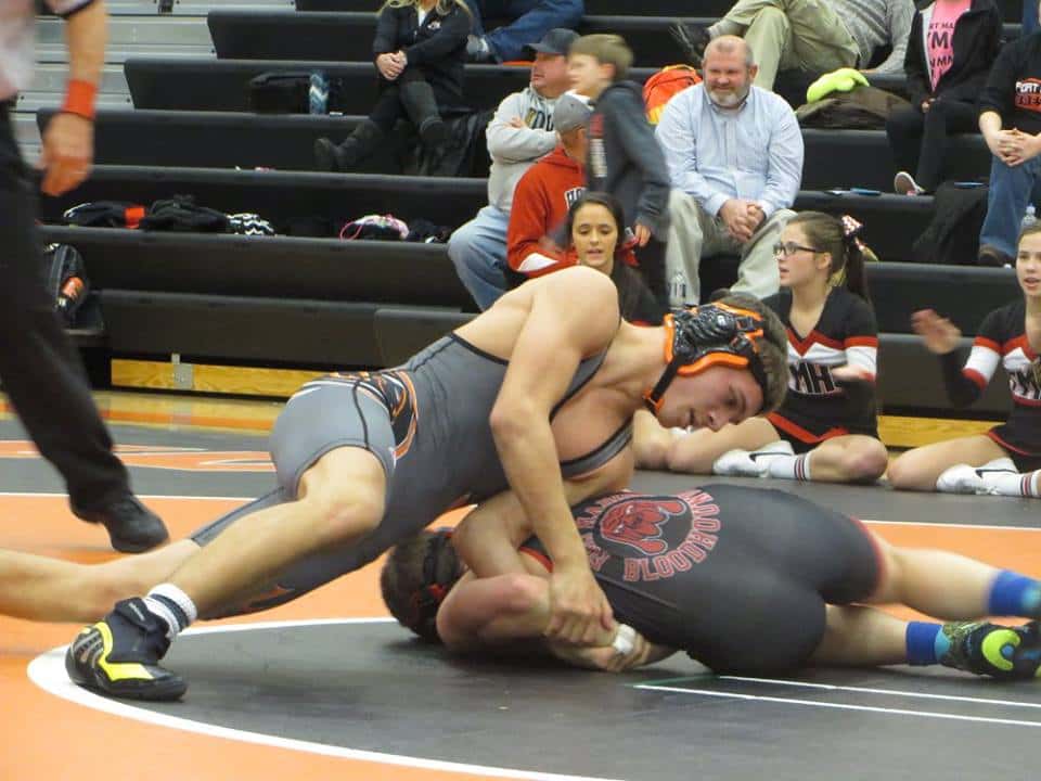 Washington junior Kyle Anderson attempts to turn Fort Madison’s Kaleb Duerre to his back during their match January 7. Photo by KCII’s Nate Gonner.