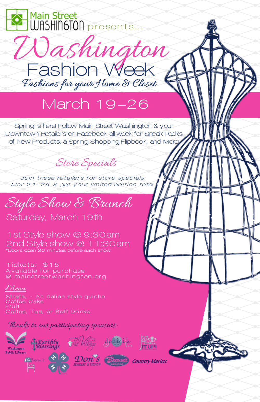 There will be a style show March 19th at 9:30 a.m. and 11:30 a.m. at Cafe Dodici featuring a brunch and clothing, shoes, housewares and more. Tickets for the style show can be purchased for $15 and are available at Main Street Washington. The week after the style show downtown stores will have specials.
