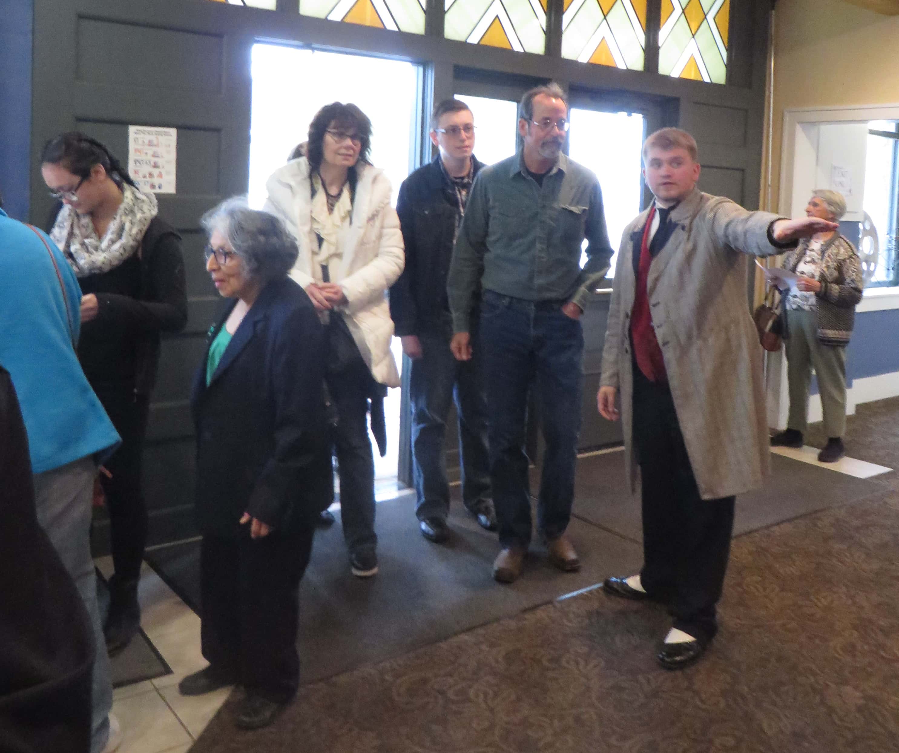 Cale Rausch, an employee of the theater in period clothing, (right) directs attendees where to be seated Sunday. Photo by Sally Y. Hart