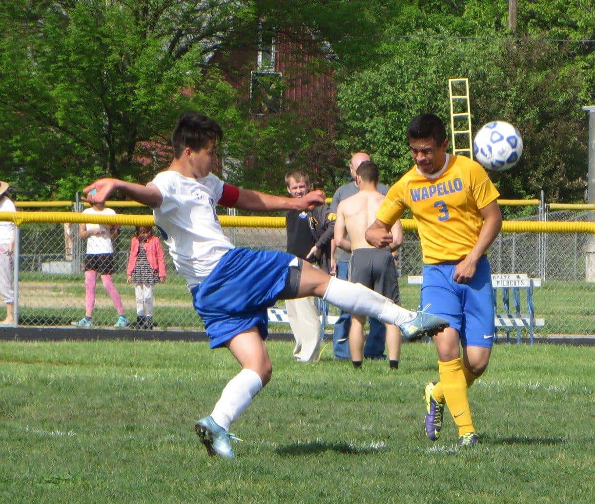 Columbus junior Eric Cantarero (left) advances the ball forward during their Southeast Iowa Super Conference battle against Louisa County rival Wapello Tuesday. Photo by KCII Sports Nate Gonner.
