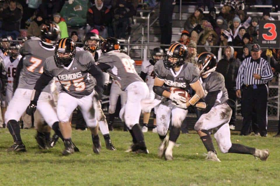 Washington graduate Jack Giardino (center) takes the handoff from quarterback Ryan Reighard during the Demons’ first round playoff game versus the Solon Spartans. Photo by Susan Harshman, Washington Demon Football.