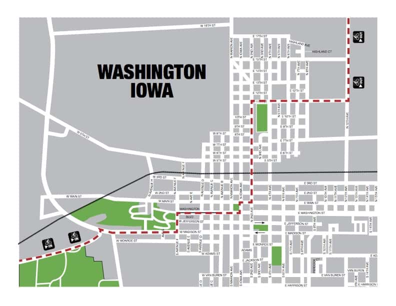 Friday, cyclists will enter Washington on Old Highway 92, along the north side of the fairgrounds and then travel into town on West Madison Street, go north two blocks on South Avenue F and east to the square on West Washington Street.