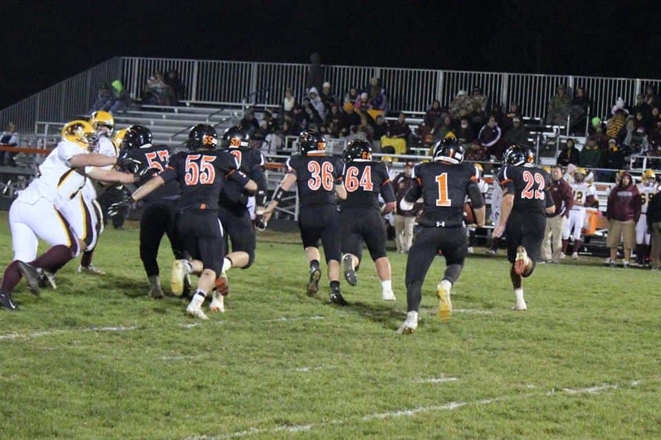 Washington quarterback Ryan Reighard (No.1) follows his offensive line during a designed run play during the Demons’ senior night game versus the Mount Pleasant Panthers. Photo courtesy of Susan Harshman/Washington Demon Football.