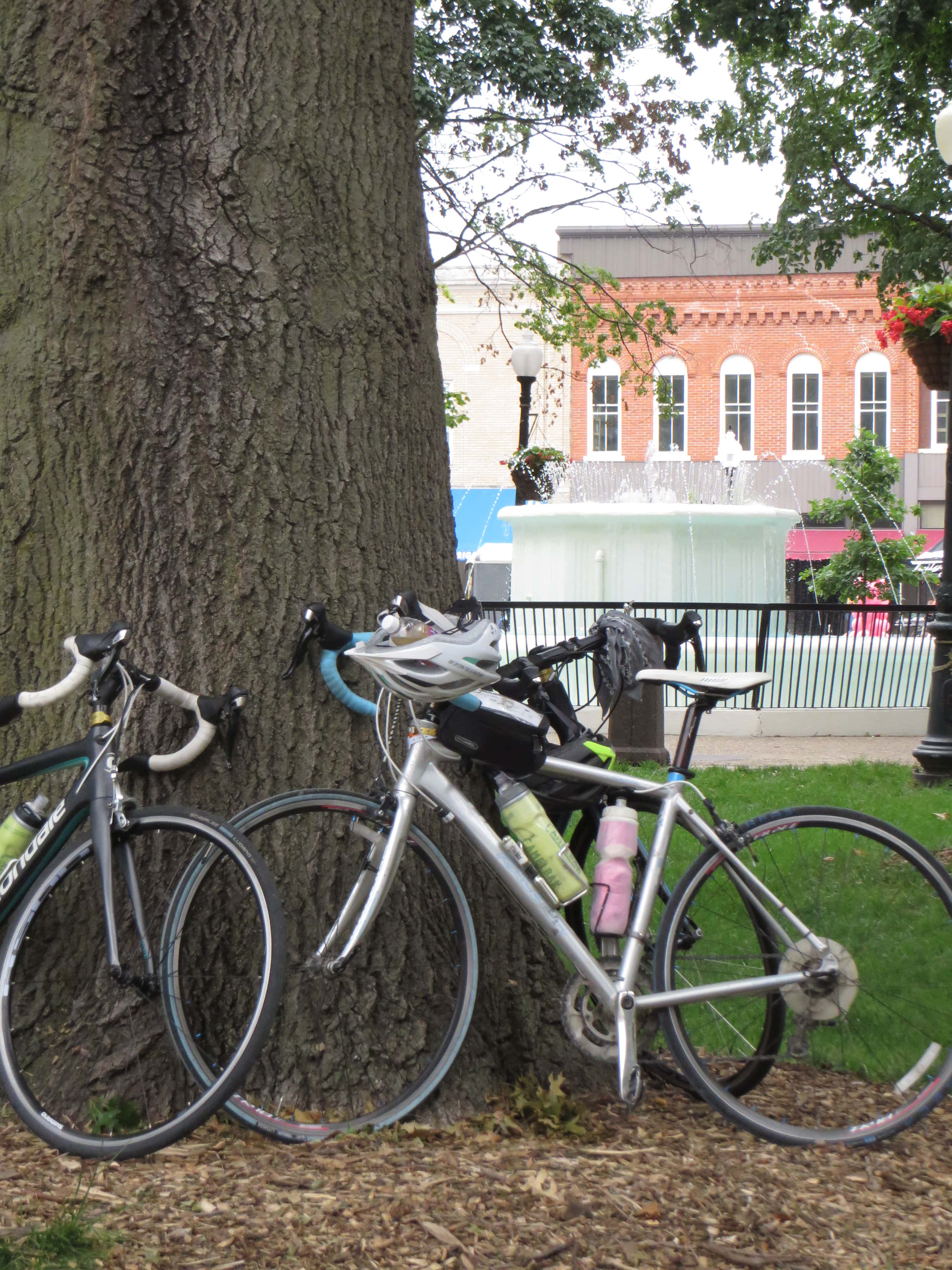 Bicycles lean against a tree in Washington’s Central Park near the Centennial Fountain Friday during RAGBRAI. Photo by Sally Y. Hart