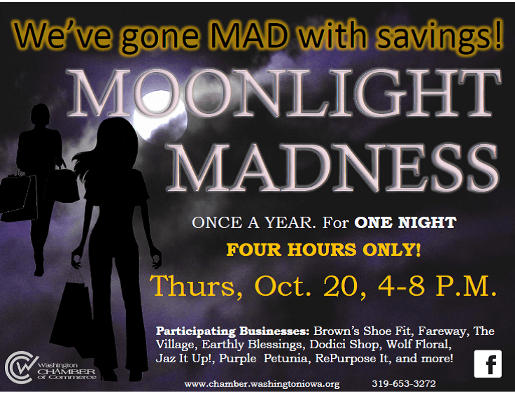 Mad deals are coming to downtown Washington businesses tomorrow evening. The annual Moonlight Madness event is returning ahead of Halloween. The Washington Chamber of Commerce organizes the event and this year there are at least eight businesses taking part. The shops will stay open later than normal and the spooky savings will be available from 4 to 8 p.m. Participating businesses include Brown’s Shoe Fit, Fareway, The Village, Earthly Blessings, Dodici Shop, Wolf Floral, Jaz It Up!, Purple Petunia, and RePurpose It.
