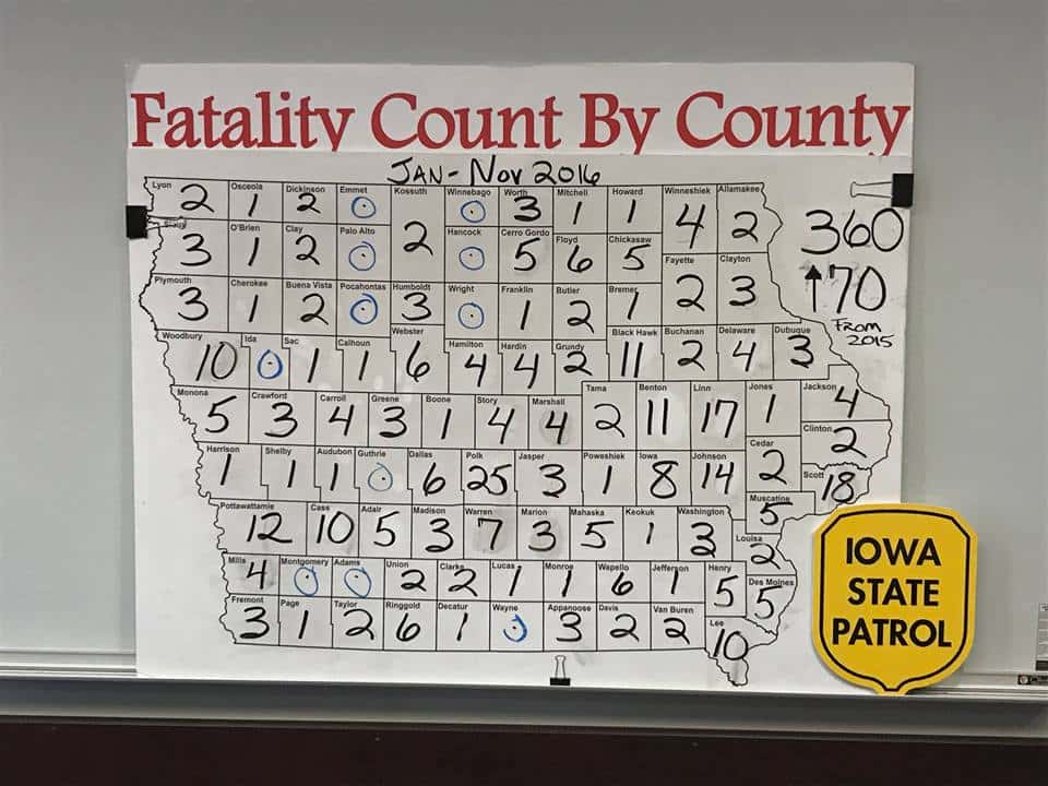 Traffic fatalities by county as of December 2nd. Photo from Iowa State Patrol.