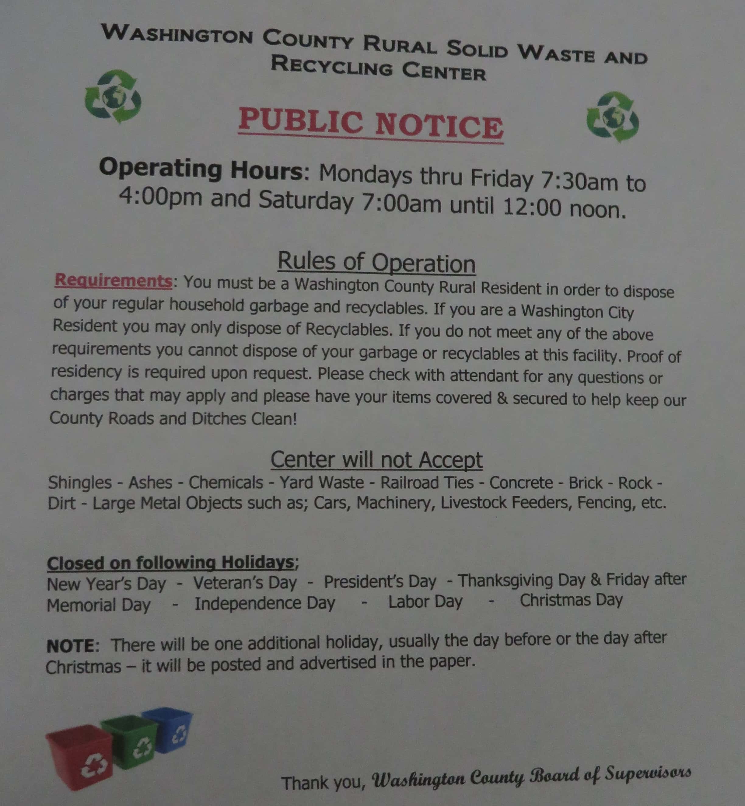 In order to dispose of regular household garbage and recyclables at the Washington County Recycling Center, you must be a rural resident of Washington County. Lynn Whaley, owner of WEMIGA, which is the company that is now operating the Washington County Recycling Center, spoke at Tuesday’s Washington County Board of Supervisors meeting. He said, since beginning December 1st they’ve seen the rules of operation not be followed by patrons. He said they’ve had people bring ashes, which aren’t accepted, as well as mattresses from Ainsworth.