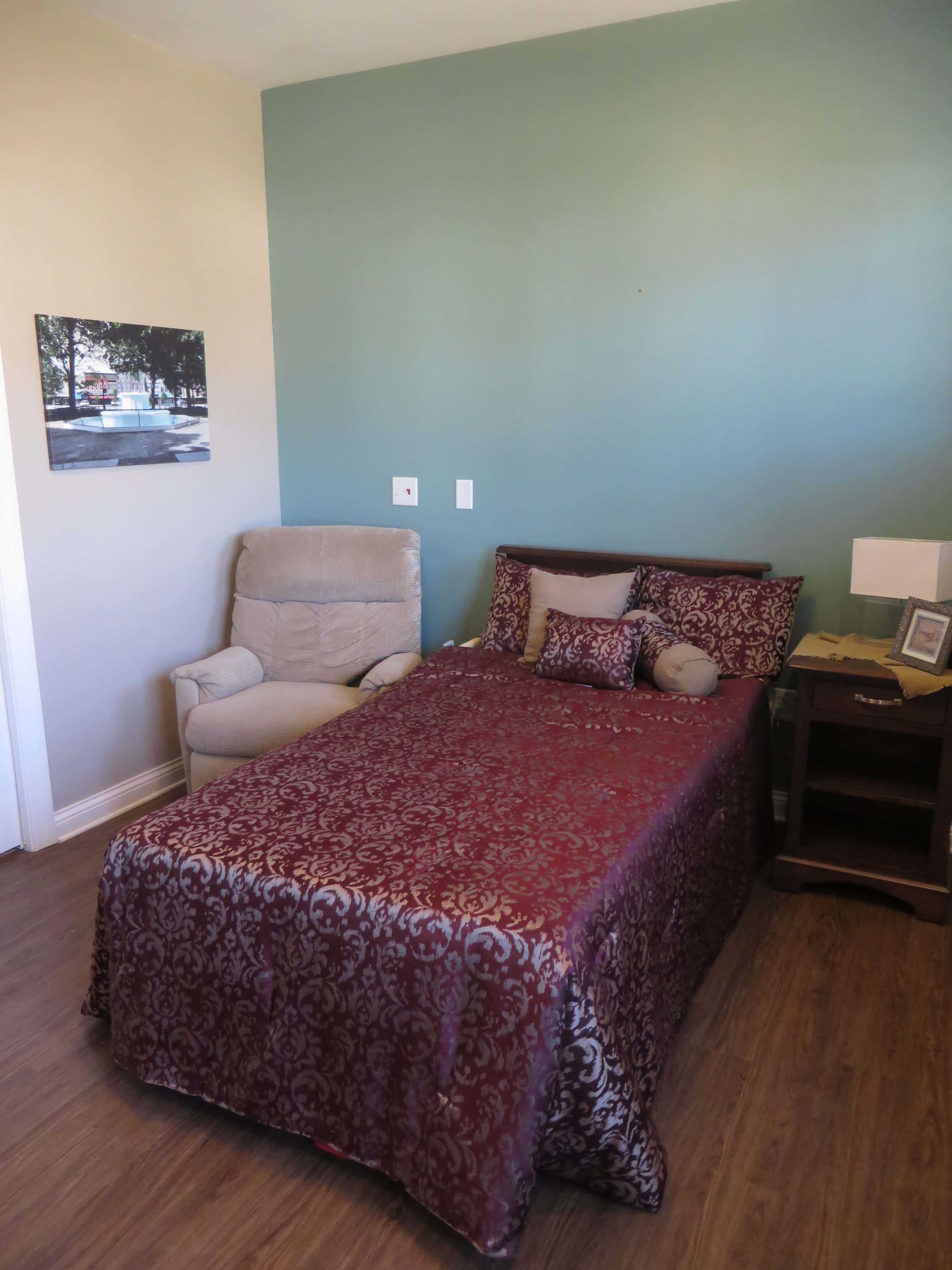 Each room will come with a Smart TV, an LED light, closet, and a headboard, nightstand and dresser made in Kalona out of solid cherry wood. Each room also has a European shower, meaning they are zero-level entry to make it easy for residents to use regardless of mobility. The three households are connected by one main hallway. One of the households, Rosewood, is a mid- to advanced-memory care household.