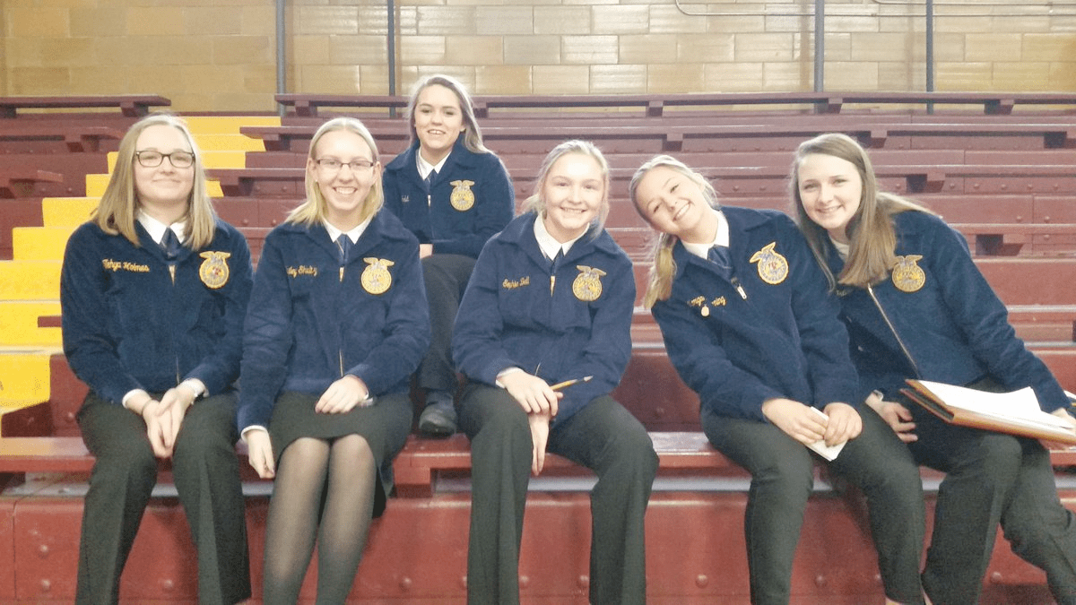 Contributed image – FFA members wait to compete in their events, from left, Ellie Bell, Hailey Shultz, Ellie Todd, Sophie Bell, Morgan Brinning, and Gracie Greiner.