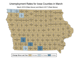 According to Iowa Workforce Development, Washington County’s unemployment rate in February was 3.6% and in March it fell to 2.7%. That’s a difference of 400 people being unemployed in the county in February dropping to 300 in March. In March of 2017 Washington County’s unemployment rate was 3.3%. Overall for the State of Iowa unemployment went from 2.9% in February to 2.8% in March.