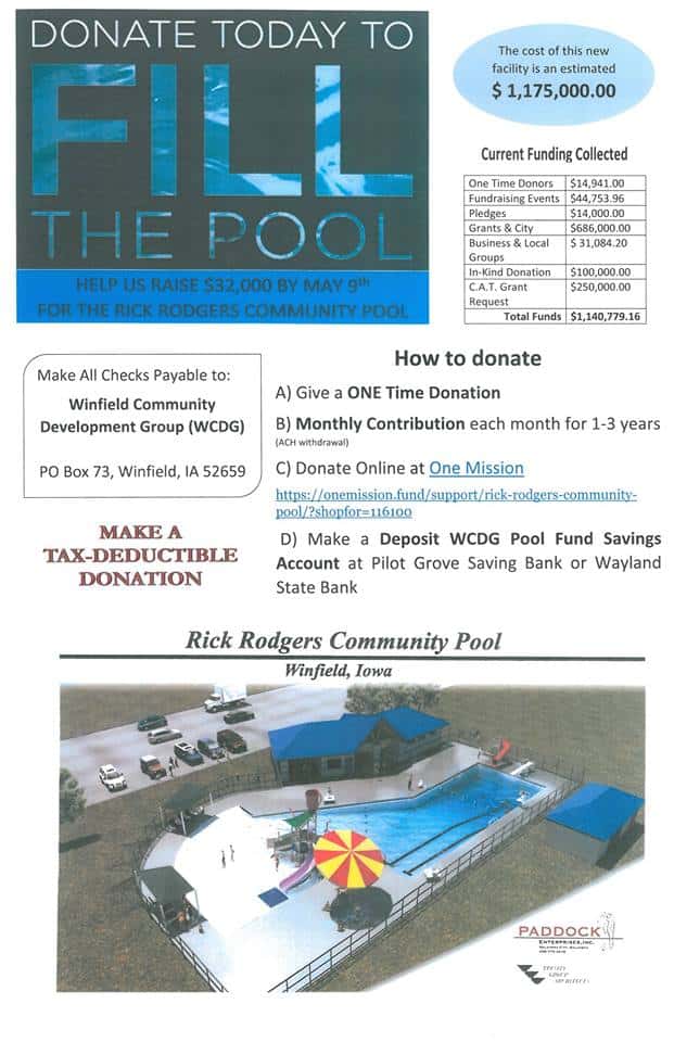 The group has been raising funds for the Rick Rodgers Community Pool to replace the former pool that was owned by the Twin Lakes Country Club. WCDG has a meeting with the Enhance Iowa Board Community Attraction & Tourism grant committee on May 9, and their goal is to have the remaining $32,000 raised by then so the committee will award them the last-dollar-in $250,000 grant.