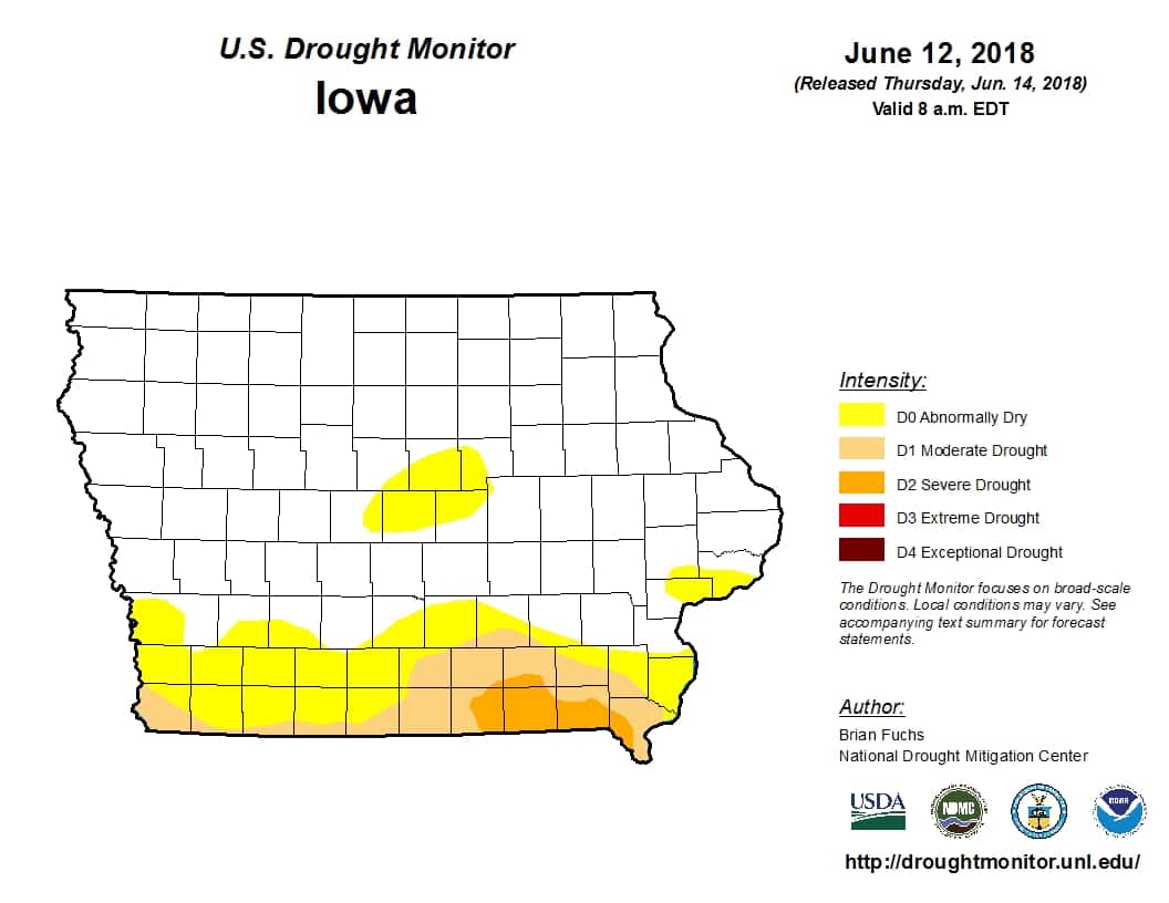 Six counties are now experiencing severe drought; these counties include Lee, Van Buren, Wapello, Davis, Appanoose, and Monroe. Currently 2.32% of Iowa is in severe drought, 9.36% is in moderate drought and 25.49% is abnormally dry. Washington County is free of any drought conditions. Jefferson and Henry Counties are both experiencing moderate drought in their southwest corners with abnormally dry conditions in the northeast.