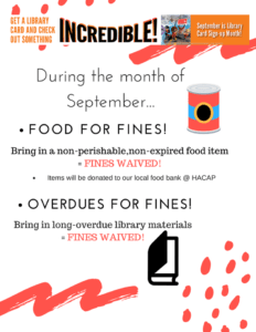 Save That Book will take place at 4 p.m. September 12th, and Crafternoon will take place at 4 p.m. September 19th at the library. Adolescents are also welcome to join the Literary Alliance Book Club meeting at 4 p.m. September 26th. The library is also accepting non-perishable food items for overdue library materials, which will be donated to the Washington HACAP food pantry. For more information on these events or to join the Teen Advisory Board call the Washington Public Library at 319-653-2726.