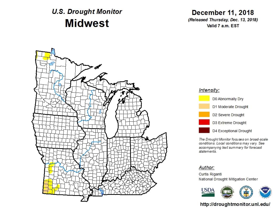One year ago over half of Iowa was experiencing drought conditions, but that’s not the case today. Last year, 7.4% of Iowa was in moderate drought and 53.1% was abnormally dry. Currently Iowa has no drought conditions. The entire Midwest region has less than one percent in moderate drought conditions, and that is in southwest Missouri.