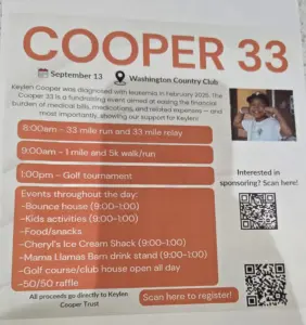 This Saturday a fundraising event is being held at the Washington Golf and Country Club for Keylen and his family. People can sign up to take part in a 33 mile run, 33 mile relay, one mile run or walk, a 5k run, or a golf tournament. Throughout the day there will be bounce houses, kids activities, a 50/50 raffle, and food available. All funds raised will go to the Keylen Cooper Trust to assist with easing the financial burden of medical bills and related expenses.