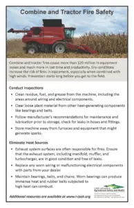 In case of a fire, turn off engines, get away from the machinery, and call 911. Those working in dry fields should keep a list of 911 addresses relevant to their field locations. This will assist emergency crews in locating the fire more quickly.