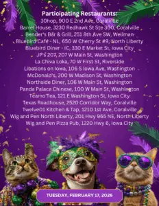 Shelter Director Amber Talbot shares more on the fundraising event, “We have Mardi Paws and Cat Tuesday as well, so we have several restaurants partnering with us collaboratively that night, some are through the day and all night, and will donate a percent of sales to the shelter. So, it ends up being a pretty good fundraiser for us when everyone collaborates together. So, watch for those partnering restaurants. Those are all kind of scattered throughout Washington County as well as Johnson County, so you don’t have to live locally to support our Mardi Paws event.”