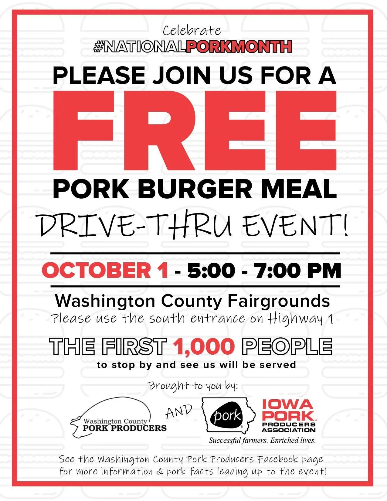 A free pork burger meal is being held at the Washington County Fairgrounds Wednesday, October 1st from 5-7 p.m. Attendees should use the south entrance on Highway 1 and the first 1,000 people will receive a meal provided by the Washington County Pork Producers and Iowa Pork Producers Association.